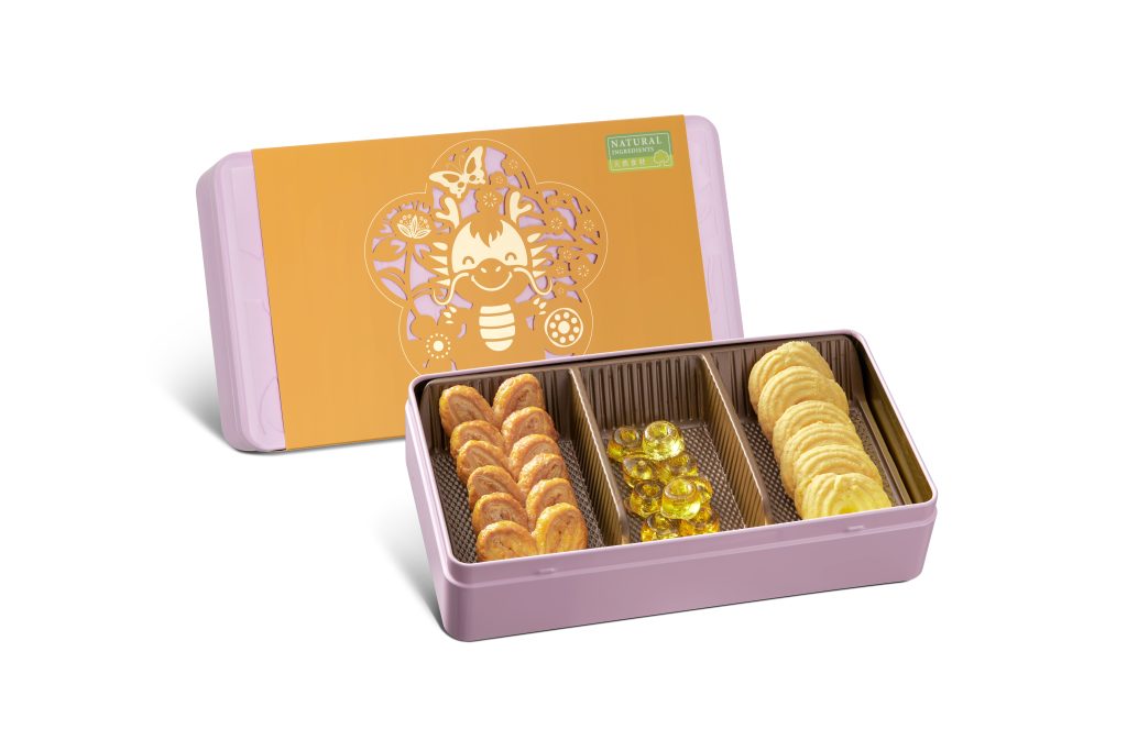 The gift box features Butter Cookies, Palmiers, and Natural White Honey Sweets. It packaged in an eye-catching bright orange paper sleeve with a cute dragon theme. It’s perfect for sharing with friends and family.